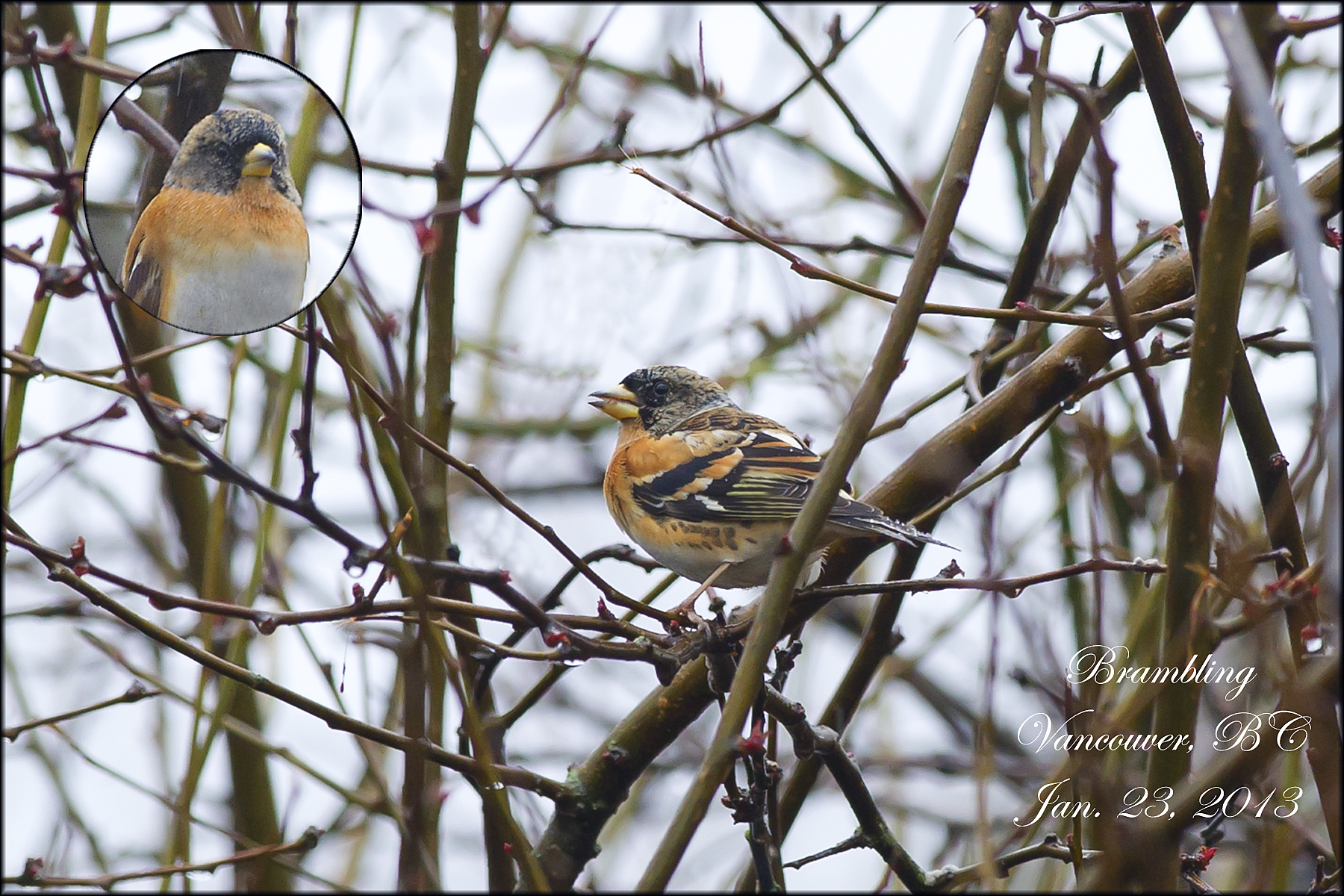 A short drive through traffic and we were at Laurel and West 17th in Vancouver. We went to the back lane of the house and looked around the yard, and saw many birds, including Anna’s Hummingbirds, House Finches, Black-capped Chickadees, Song, Fox, Golden-crowned and House Sparrows, and Juncos but not the Brambling. There was a man standing in the laneway and we asked if he’d seen the bird. “it was just here 5 min ago” he replied and I thought here we go again, another hour wait for it to return.