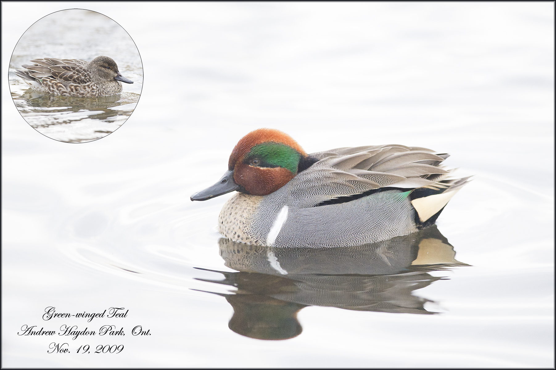 I heard through a friend that a hybrid Teal was being seen in the Vancouver area. Off we went in search of this bird, thinking to myself how hard could it be. Here in Ontario we usually see pairs of birds, sometimes 5-6. I wasn’t prepared for the sight that greeted me when I turned the corner and saw the water. There were probably 200-300 Green-winged Teal on the water.