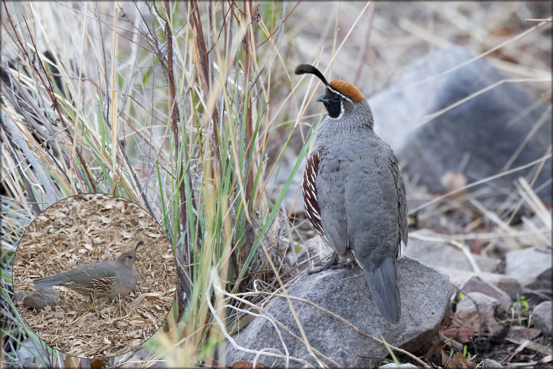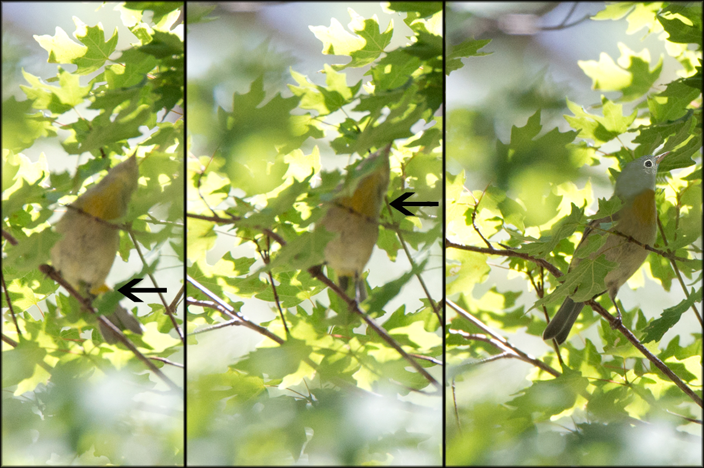 At 2 o’clock Rick and I decided to turn around, get back down the canyon. It was time to go back to the ground feeders, to try and to get a Montezuma Quail. On the way down we ran into a flock of Bushtits. I noticed one of them had a bit of yellow as it flew away, and the chase was on. This bird flitted from branch to branch, never stopping for long. I soon realized I had my last ABA Warbler in my sights, my grail warbler, the Virginia’s. It really never gave me a good chance for a photo but I did manage to get a few but the bird was hidden by foliage. The 2 images below on the left show the yellow coverts and the yellow patch on the breast. The 3rd image is my sharpest, and would have been a keeper but his head was hidden behind a leaf. I re-created the head for this thread. I will run into this bird again.