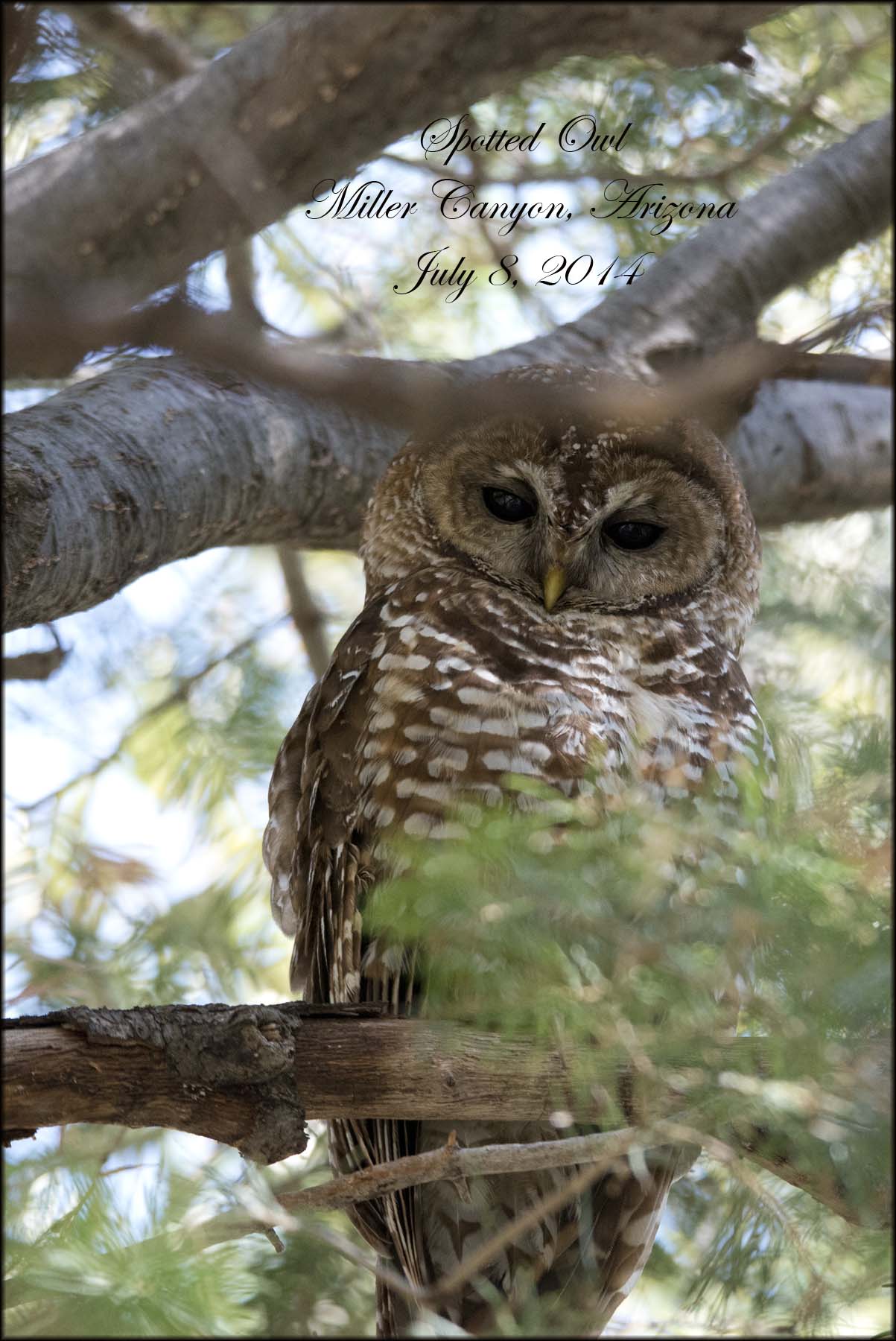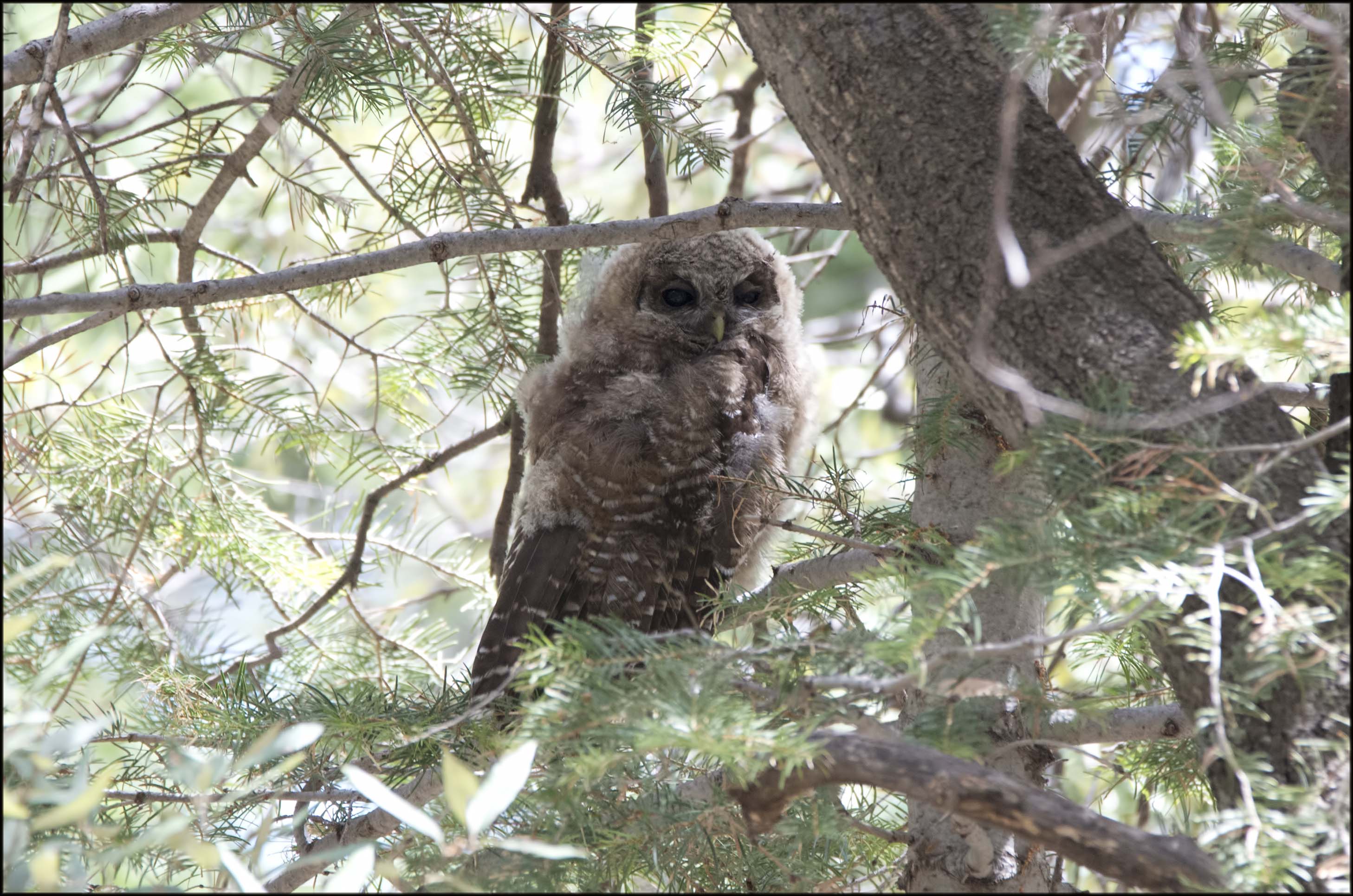 Thirty minutes more brought us to an area that Tom mentioned should hold Red-faced Warblers and until recently the Spotted Owls. A little further ahead, we spotted a family of Spotted Owls just sitting by the trail. They couldn’t have cared less we were there, all they wanted to do was sleep.