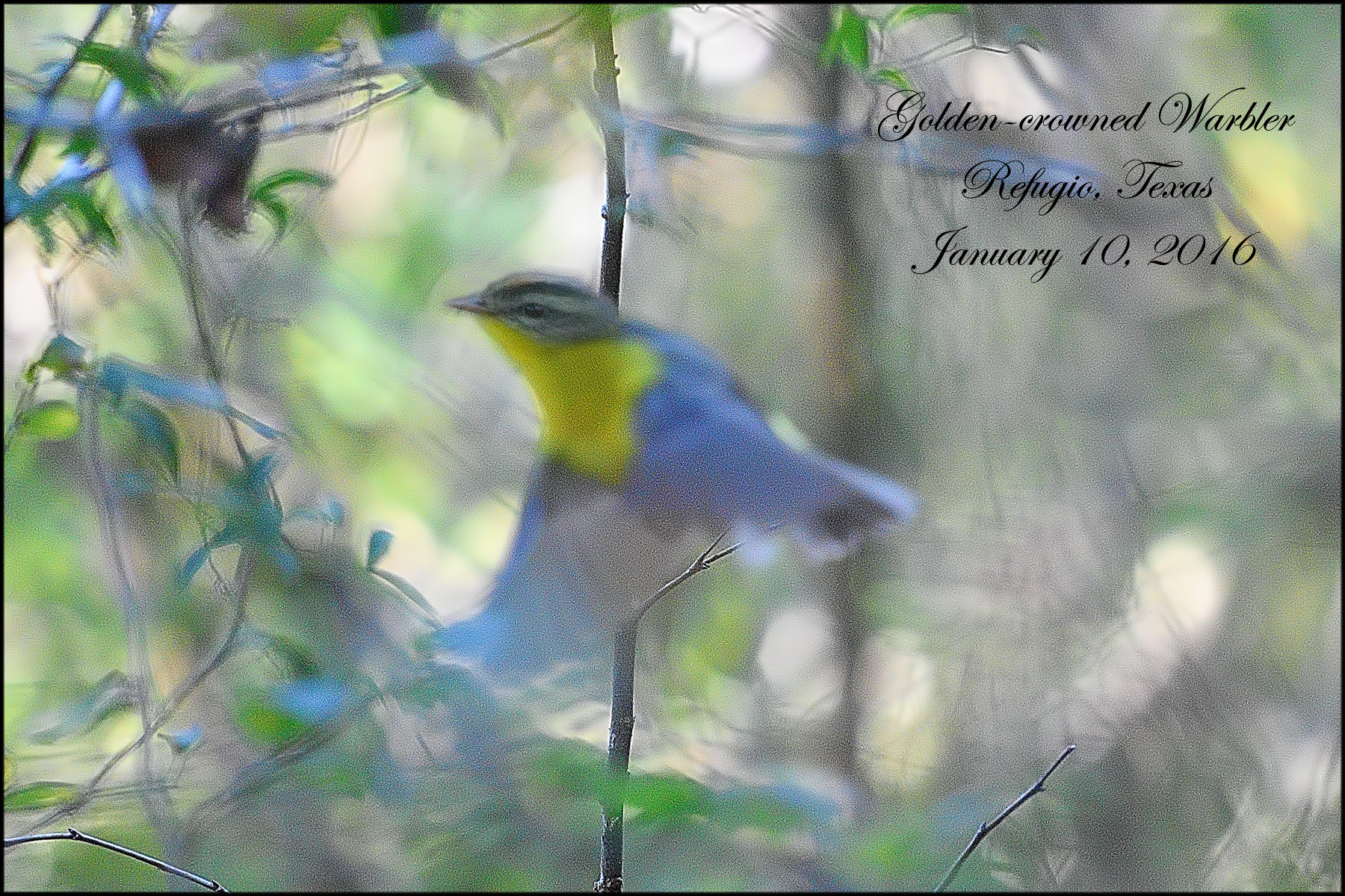 After spending 6 hours looking for the Warbler I got my first glance and only look at this bird. One photo, no time for setup and very Photoshop enhanced but ABA Bird – Golden-crowned Warbler was in the books.